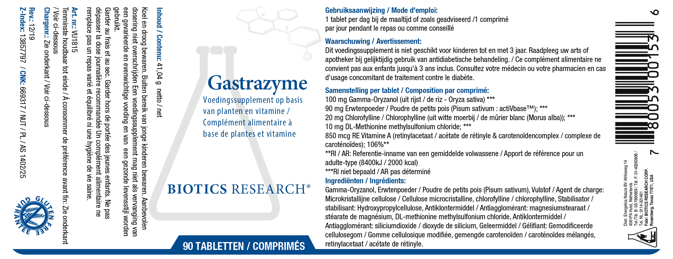 Vulmiddel: microkristallijne cellulose, gamma-oryzanol, pisum sativum (actiVbase: biologische plantencultuur, bevat van nature polyfolen, SOD en catalase), disintegrant: gemodificeerde cellulosegom, chlorofylline, vitamine U, antiklontermiddel: magnesiumstearaat, vitamine A, gemengde caretenoïden.
